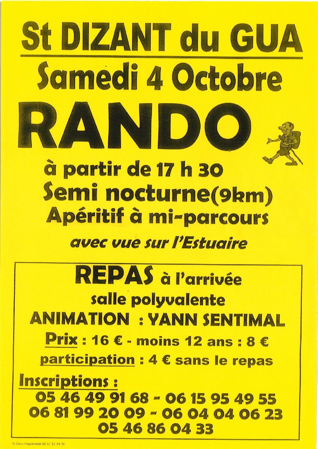 Actualités / Animations/ Evènements RANDO SEMI NOCTURNE DE 9KM AVEC APERITIF A MI-PARCOURS ET REPAS A L’ARRIVÉE SAMEDI 4 OCTOBRE A 17H30 Octobre Rose et Movember Ouverture de l’agence france services a Saint Thomas de Conac PROCÉDURE DE REPRISE DES CONCESSIONS A L’ETAT VISUEL D’ABANDON recensement des personnes agées, vulnérable LA PERMANENCE DE FRANCE PARKINSON INFORMATION IMPORTANTE : VOL DE CABLES CUIVRE Ateliers thématiques (Emploi, Formation, Orientation) accompagnement pour les viticulteurs en grande difficulté POULET CUIT SUR LE PARKING DE L’EPICERIE Inscription en Petite Section (PS) pour les enfants nés en 2022. Inscription scolaire 2025/2026 Voir toutes les actualités