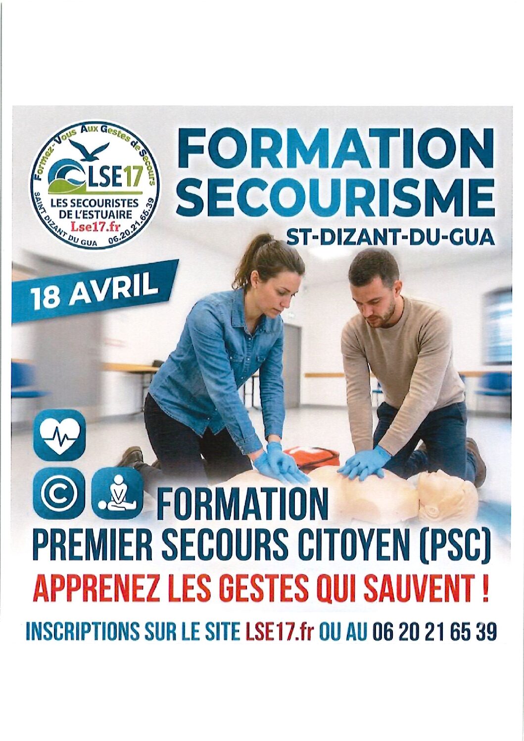 Le samedi 18 avril 2026 Cette formation vous est proposée par, l’association les Secouristes de l’Estuaire. Dans la salle des fêtes de Saint-Dizant-du-Gua Appelez et réserver vos place au 06.20.21.65.39